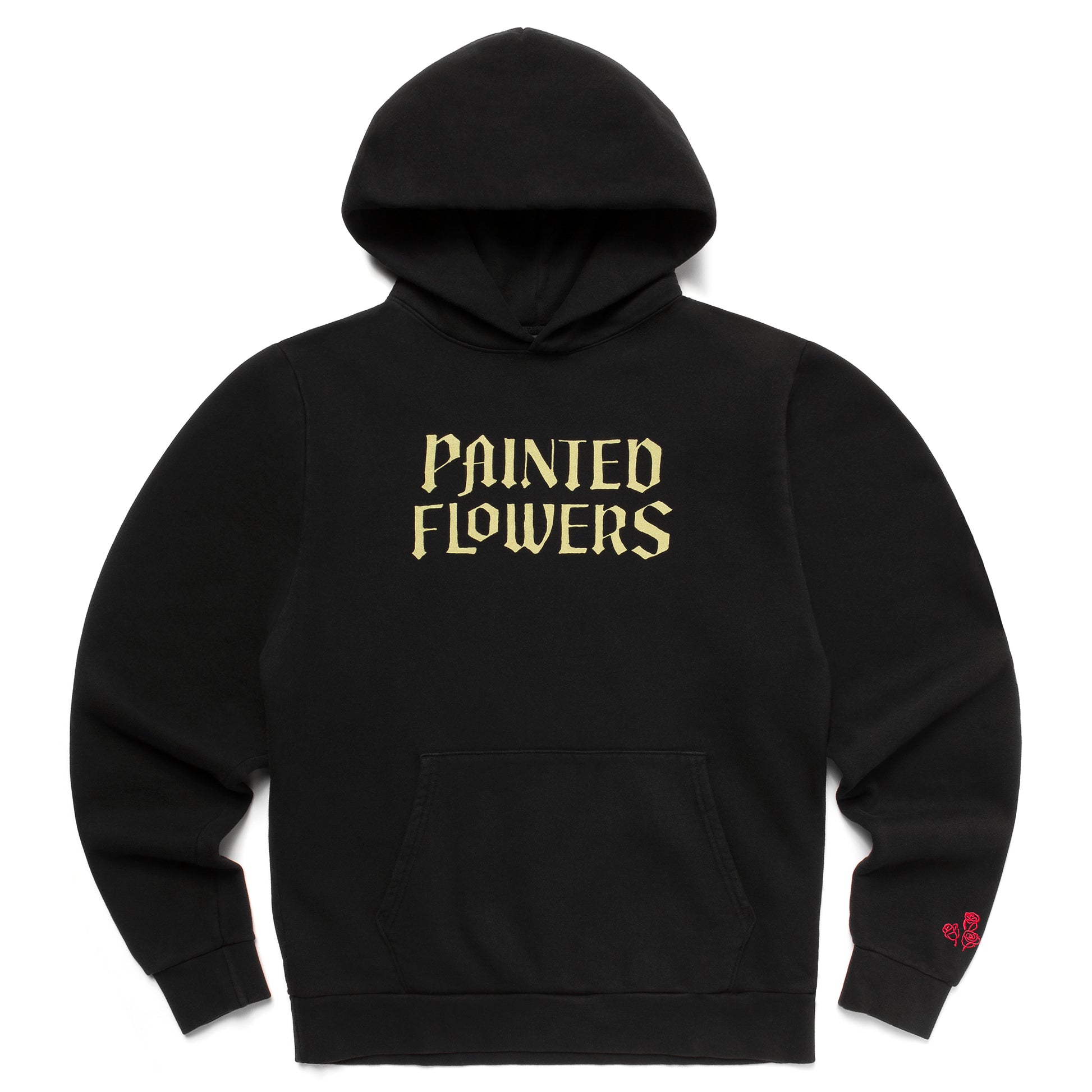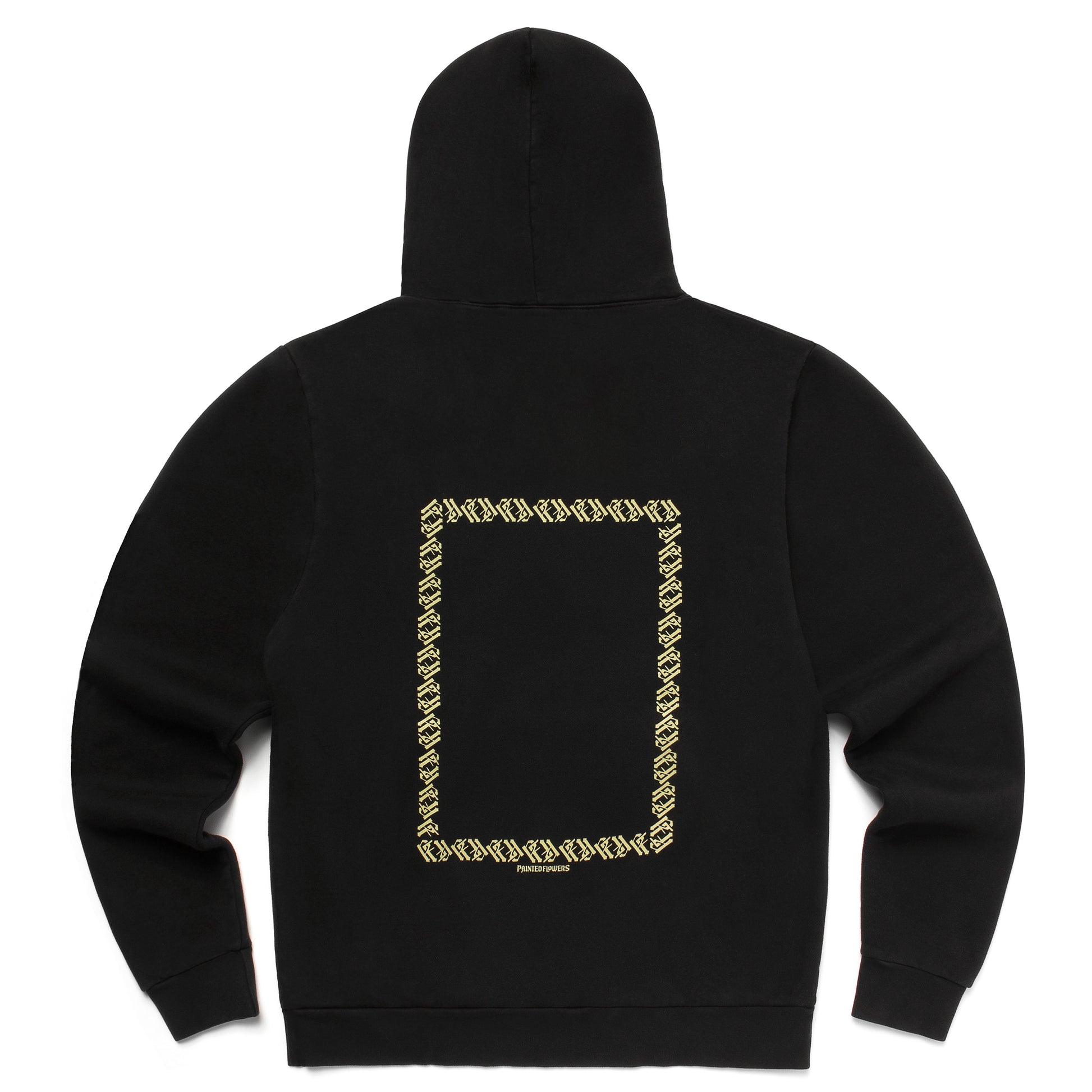 14 oz brushed gabardine french terry hooded sweatshirt with chest and back print and embroidery detail on left cuff. Custom made in Los Angeles.